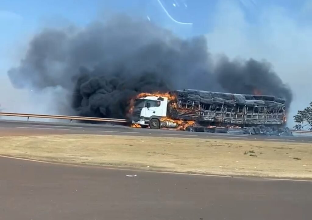 Uma carreta foi tomada pelas chamas em um incêndio de grandes proporções registrado na manhã desta quinta-feira (18) no km 598 da BR-163, próximo a praça de pedágio em São Gabriel do Oeste. O fogo começou por volta das 8h30 e destruiu o veículo, que transportava carga de algodão.