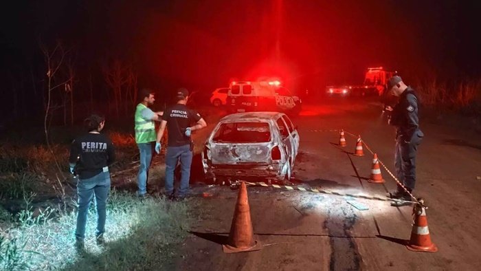 O corpo de uma pessoa ainda não identificada foi encontrado carbonizado dentro de um carro em chamas na madrugada desta segunda-feira (6), às margens da BR-163, em Rio Brilhante.