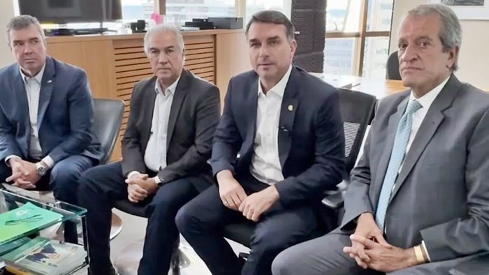 Além de Riedel, Reinaldo e Flávio Bolsonaro, participaram do encontro o presidente nacional do PL, Valdemar da Costa Neto, o senador Rogério Marinho e o secretário de Governo de Mato Grosso do Sul, Rodrigo Pérez.