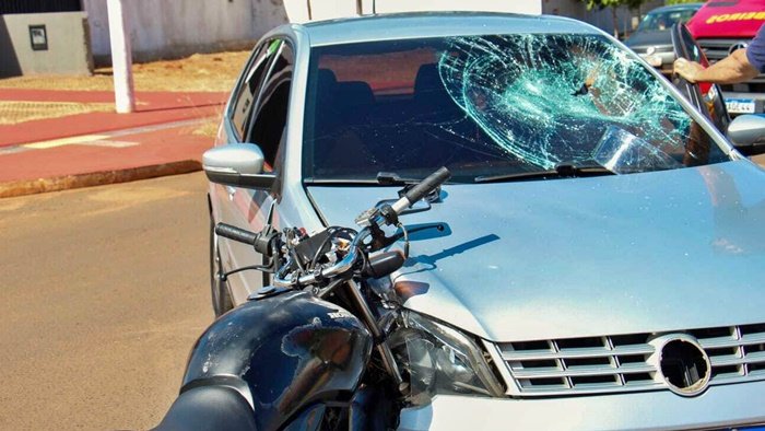 Com o impacto, a motocicleta ficou enroscada no veículo, enquanto o condutor da moto foi arremessado contra o para-brisa do carro e caiu em seguida no asfalto.