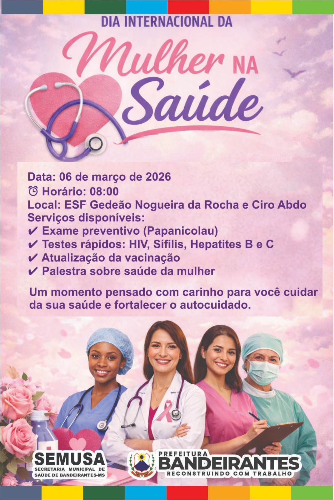 A Prefeitura de Bandeirantes, por meio da Secretaria Municipal de Saúde (Semusa), promove nesta sexta-feira (6), a partir das 8h, o projeto Saúde da Mulher. A programação será realizada nas unidades de Estratégia de Saúde da Família (ESFs) Ciro Abdo e Gedeão Nogueira da Rocha.
