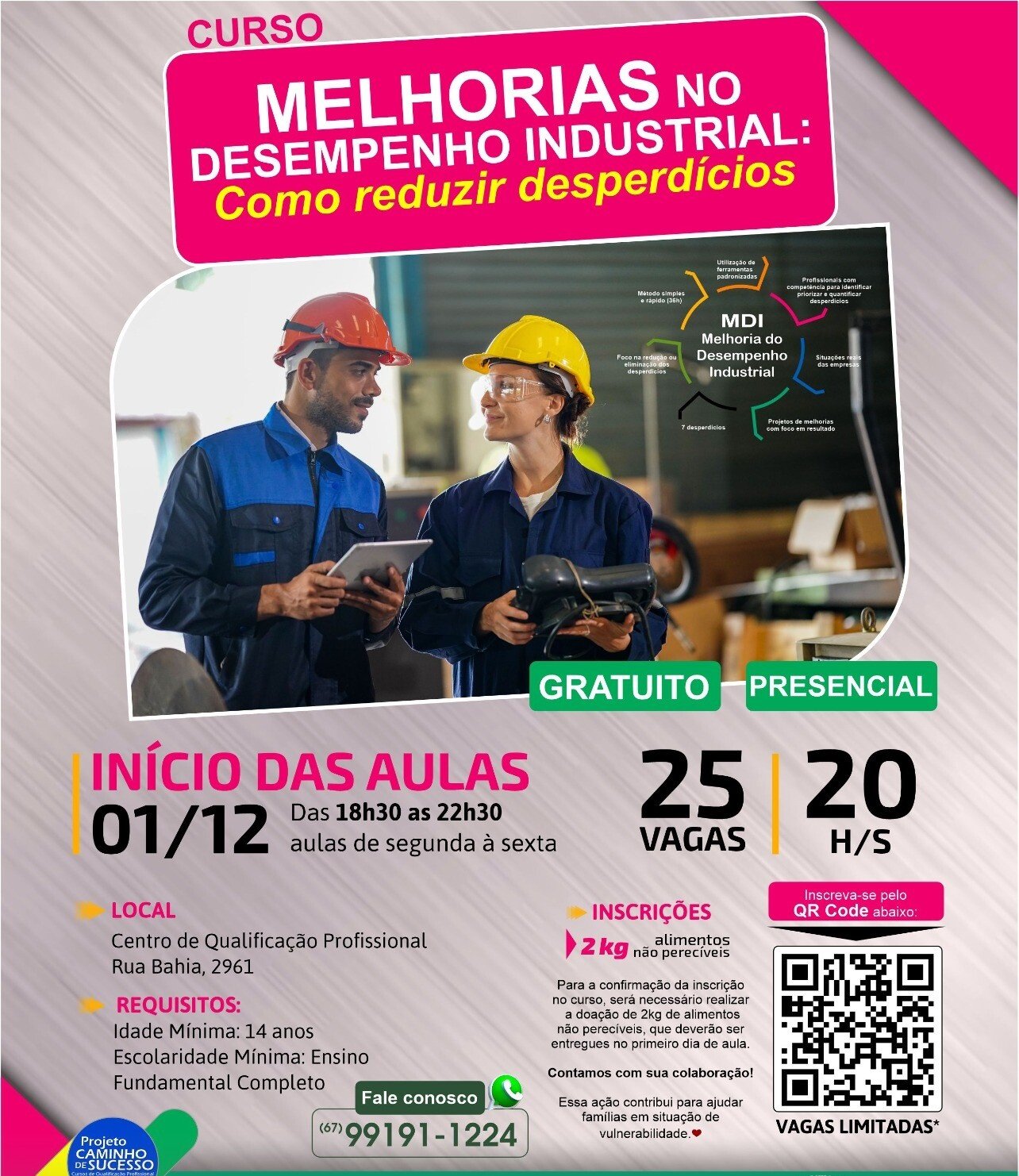 A Prefeitura de São Gabriel do Oeste, por meio da Secretaria de Desenvolvimento Econômico, abriu inscrições para o curso gratuito “Melhorias no Desempenho Industrial: Como reduzir desperdícios”, que será oferecido no Centro de Qualificação Profissional (CEQUAP) em parceria com o Sistema FIEMS/SENAI.