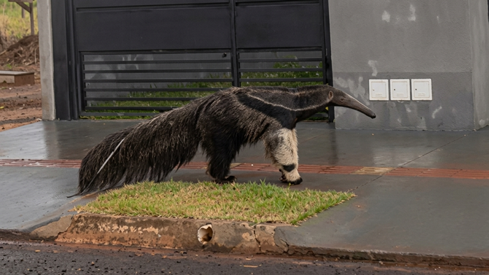 Um tamanduá-bandeira foi visto passeando nesta terça-feira (14) no residencial Rosada, em São Gabriel do Oeste. O animal saiu de uma área de terreno, atravessou a rua e chegou até a calçada, retornando em seguida ao perceber a presença de humanos.